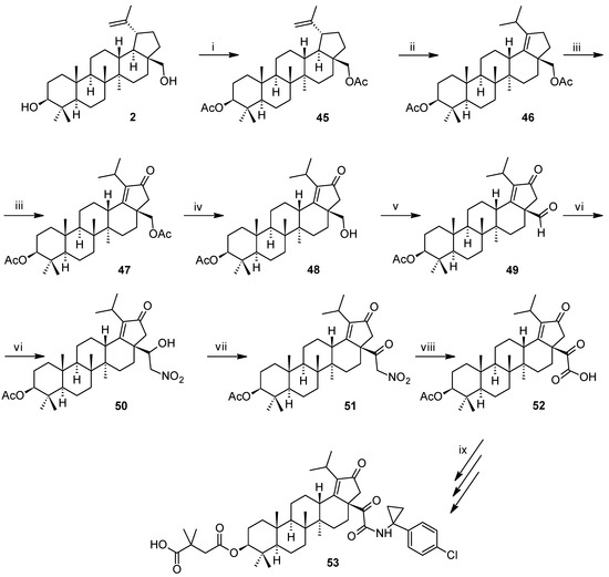 Synthesis of bevirimat derivatives II. Legend: i: Ac2O, toluene, ii: HBr/AcOH, AcOH, Table 2. iii: Na2Cr2O7, NaOAc, toluene, AcOH, Ac2O, iv: KOH, toluene, ethanol, v: PCC, silica gel, DCM, vi: CH3NO2, triethylamine, vii: DMP, DCM, viii: NaNO2, AcOH, DMSO, ix: (a) oxalyl chloride, DCM, (b) 4-chloroaniline, TEA, DCM, (c) HCl (g) in dioxane, (d) 2,2-dimethylsuccinic anhydride, DMAP, pyridine.