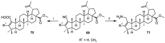 To continue a search for agents active against herpes simplex virus, unsaturated acids, including difficultly accessible ceanothane-type ones, were prepared by the same authors, using alkaline hydrolysis of semi-synthetic triterpenoids with 1-cyano- or 3-methyl-1-cyanoalkene fragments in five-membered ring A (Scheme 11) [69]. Regioselective reduction of 1-cyano-19β,28-epoxy-2-nor-18αH-olean-1(3)-ene by DIBAL-H resulted in a synthesis of 2-aminomethyl-19β,28-epoxy-2-nor-18αH-olean-1(3)-ene. The synthesized triterpene derivatives possessed antiviral activity against HSV-1. Compound 70 (ET50 = 17.7 µM) was the most active compound of this small series, while 71 was less active.