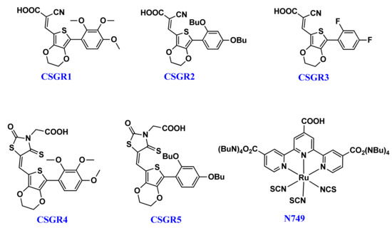 3,4-ethylenediox-thiophene (EDOT) unit has been widely used as a conjugated bridge unit between the acceptor and donor groups of DSSC dyes, due to its capability to accelerate co-planarity and enhance the light harvesting capacity [41]. So far, 6% efficiency has been reported with EDOT based dyes, which were further extended to 8.2% by optimizing the anchoring group [30]. To carry forward the advantages of small organic co-sensitizers in cocktail DSSC and emphasize the role of EDOT central moiety, we have designed five small size new organic co-sensitizers coded as CSGR1-CSGRR5 in D-π-A manner. These five co-sensitizers (CSGR1-5), as shown in Figure 1, were synthesized by changing the donating groups (2,3,4-trimethoxypheny, 2,4-dibutoxyphenyl, 2,4-difluorophenyl) and anchoring groups (cyano-acrylic acid (CA) and rhodamine acetic acid (RA)) systematically and their DSSC performance as co-sensitizer with the N749 dye was examined. The final structure of CSGR1-5 dyes and N749 were shown in Figure 1.