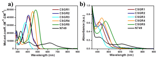 The electronic absorption spectra of co-sensitizers (CSGR1-5) in N,N-Dimethylformamide (DMF) were shown in Figure 3a, and the resultant data were summarized in Table 1. CSGR1-5 dyes displayed two major bands in the Figure 3a, the band present at the lower wavelength region corresponds to the π-π* transitions localized between auxiliary donors and EDOT center moiety and another band present at the higher wavelength region (300–550) corresponds to the charge transfer (CT) between EDOT and the CA or RA anchoring groups [42]. The wavelength maximum (λmax) of the CSGR1-5 dyes in DMF solution was 402, 408, 376, 450 and 482 nm, respectively. All the CSGR dyes have shown higher molar extinction co-efficient (εmax) than N749 (0.8725 × 104 M−1 cm−1) at 300 to 550 regions i.e., 4.3904, 4.1182, 3.3557, 4.7688 and 4.9522 × 104 M−1 cm−1. It is worth mentioning that the high εmax demonstrated by these co-sensitizers (CSGR dyes) at CT transition range was beneficial for harvesting maximum number of photons from incident light at a particular wavelength region by a minimum amount of dye loading so that it could facilitate enough space on the semiconductor (TiO2) for binding of other dye molecules. Among CA and RA based dyes, high absorption property was observed for RA based dyes (25–80 nm), which was attributed to the enhanced π-conjugation due to 4-oxo-2-thioxothiazolidine ring in RA anchoring group. Among 2,3,4-trimethoxybenzene (CSGR1 and CSGR4) and 2,4-dibutoxybenzene (CSGR2 and CSGR5) based dyes, a high absorption nature was observed for 2,4-dibutoxybenzene based dyes, which indicates the low donating nature of 2,4-dibutoxybenzene donating group than that of 2,4-dibutoxybenzene.