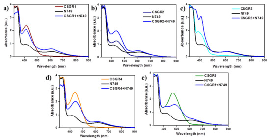 (a–e) are comparative absorption spectra of CSGR (0.05 mm), N749 (0.1 mm) and mixture of N749 and CSGR1-5 dyes (0.1 and 0.05 mm) in DMF.