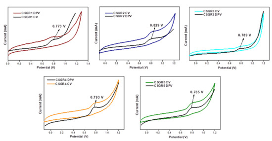 The CV was performed to ensure the electrochemical nature and evaluate positions of the ground state oxidation potential [GSOP (Eox)] and excited state oxidation potentials [ESOP (Eox*)] of the CSGR dyes. CV and DPV were executed for CSGR dyes using DMF solution of 0.1 M TBAPF6 support electrolytes. The corresponding curves and data were presented in Figure 6 and Table 1. The analyzed GSOP of CSGR1-5 dyes were 0.773, 0.829, 0.789, 0.793, and 0.785 V (versus NHE) respectively, Here, onset oxidation potentials of oxidation peak of CV and DPV were used to calculate the GSOP, which were highly positive enough than that of redox electrolyte (I−/I3−), i.e., 0.4 V (−5.2 eV) versus NHE [43] for efficient dye regeneration. The ESOP (Eox*) of CSGR1-5 dyes were 1.827, 1.751, −2.021, −1.535 and 1.717 V, respectively, which were obtained by subtracting E0-0 from Eox (Eox – E0-0). Here E0-0 of CSGR dyes was measured from the intercept plots of absorption and fluorescence (Figure 5) by using the following formula: