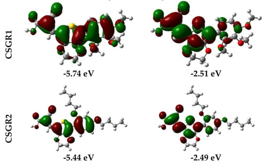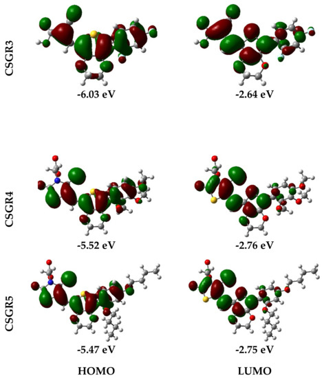 Electron density distribution in frontier molecular orbitals of the dyes CSGR1 to CSGR5 and the corresponding eigenvalues.