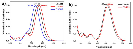 The optical properties of the dyes were obtained using TDDFT formalism, and the simulated absorption spectra were shown in Figure 10. The theoretically calculated absorption spectra reproduced the absorption bands that were observed in the experimental UV-visible absorption spectra. CSGR1 to CSGR3 dyes have shown intense absorption maxima around 375 nm, whereas, CSGR4 and CSGR5 dyes have shown intense absorption maxima around 460 nm. Compared to the absorption of the dye CSGR1, the dyes CSGR2 and CSGR3 have shown 8 nm bathochromic and 9 nm hypochromic shifts, respectively. Among CSGR4 and CSGR5 dyes, CSGR5 has shown 9 nm bathochromic shifts compared to that of CSGR4. These intense absorption peaks originated mainly from the HOMO → LUMO excitation. The observed shifts in the experimental absorption spectra were reproduced from the simulations.