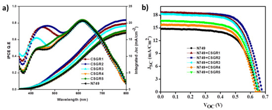 (a) IPCE and integrated current density plots and (b) are the J-V plots of DSSCs based on N749 dye with CSGR1-5 dyes.
