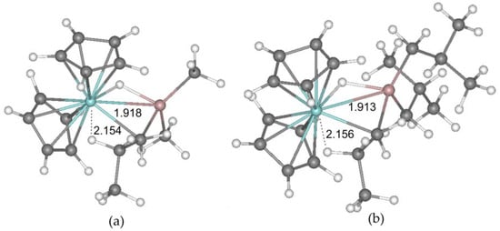 Calculated geometries of I-2H-bo complexes for (a) R = Me and (b) R = iBu. The distances Zr-H are specified (Å).