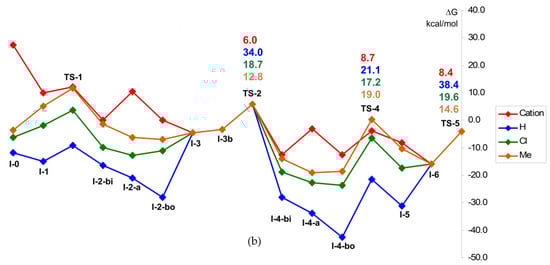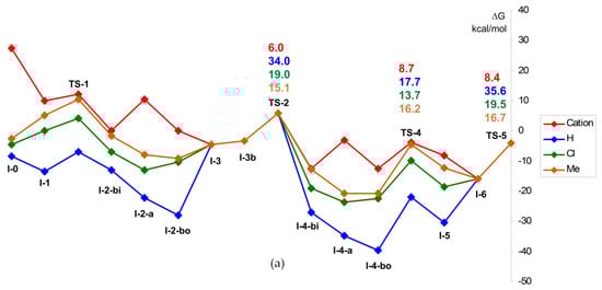 Stationary points and transition states of the initiation stage for (a) cationic and (b) binuclear mechanisms (X = H, Cl, and Me).