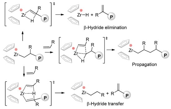 - Laine, A.; Linnolahti, M.; Pakkanen, T.A.; Severn, J.R.; Kokko, E.; Pakkanen, A. Comparative theoretical study on homopolymerization of α-olefins by bis(cyclopentadienyl) zirconocene and hafnocene: elemental propagation and termination reactions between monomers and metals. Organometallics 2010, 29, 1541–1550. [Google Scholar] [CrossRef]