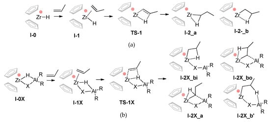 - Pankratyev, E.Yu.; Tyumkina, T.V.; Parfenova, L.V.; Khalilov, L.M.; Khursan, S.L.; Dzhemilev, U.M. DFT and Ab initio study on mechanism of olefin hydroalumination by XAlBui2 in the presence of Cp2ZrCl2 catalyst. II. olefin interaction with catalytically active centers. Organometallics 2011, 30, 6078–6089. [Google Scholar] [CrossRef]
