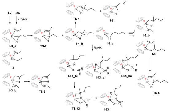 Within the framework of binuclear mechanism, we failed to find stationary points containing coordinated R2AlX and propylene molecules. Hence, the coordination of propylene resulted in loss of Zr-X bonding, and the stationary points I-3 and I-6 as well as transition states TS-2, TS-3, and TS-5 had been common for mononuclear and binuclear mechanisms. The fundamental difference between mononuclear and binuclear mechanisms had arisen at the stage of the formation of 2-methylpentyl complexes I-4X followed by β-hydride elimination via TS-4X to π-complexes I-5X.