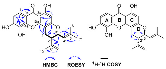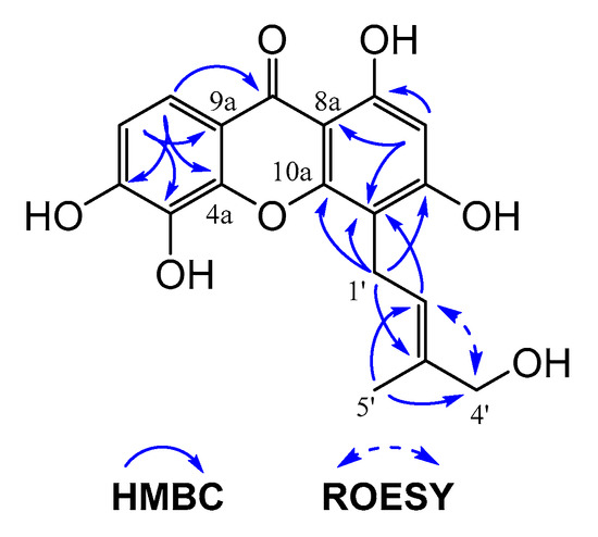 Key 1H–1H COSY, HMBC and ROESY correlations of hypxanthone B.