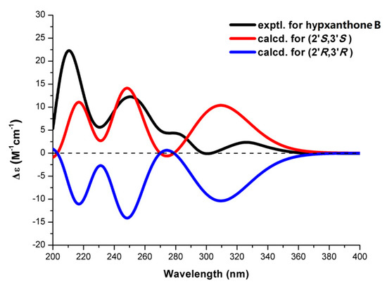 Comparison of experimental (black line) and calculated (red and blue lines) ECD spectra of hypxanthone B.