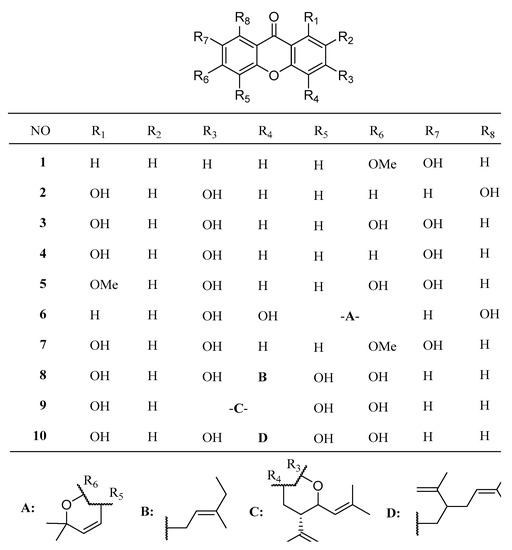 - Ruan, J.Y.; Zheng, C.; Liu, Y.X.; Qu, L.; Yu, H.Y.; Han, L.F.; Zhang, Y.; Wang, T. Chemical and biological research on herbal medicines rich in xanthones. Molecules 2017, 22, 1698. [Google Scholar] [CrossRef] [PubMed]