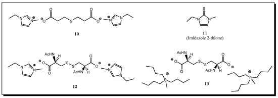- Matiello, G.I.; Pazini, A.; da Silva, K.I.M.; da Costa, R.G.M.; Ebeling, G.; Dupont, J.; Limberger, J.; Scholten, J.D. Isothiouronium salts as useful and odorless intermediates for the synthesis of thiaalkylimidazolium ionic liquids. Tetrahedron Lett. 2019, 60, 780–784. [Google Scholar] [CrossRef]