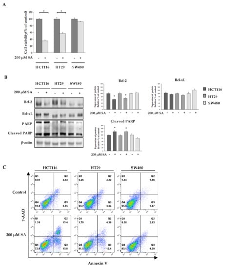 In this study, we optimized the concentration of SA using the MTT assay. As shown in Figure 1A, cell viability of HCT116 and HT29 cells dramatically reduced, whereas no effect of SA in SW480 cells was seen. To differentiate the effect of 200 µM SA on selective cell death in colon cancer cell from its effect on normal cells, we examined the cytotoxicity of 200 µM SA in CCD18-Co (normal colon) and MRC-5 (normal lung). Treatment of SA up to 1mM did not lead to cell death in both normal cells (Figure S1). This observation suggested that SA selectively induces apoptosis in HCT116 and HT29 cells, but not in normal cells. In addition, expression levels of an anti-apoptotic protein, B-cell lymphoma 2 (Bcl-2) and B-cell lymphoma-extra large (Bcl-xL), and a pro-apoptotic protein, cleaved-Poly (ADP-ribose) polymerase (cleaved-PARP) were assessed to determine whether SA induced apoptosis [11]. We found that Bcl-2 expression decreased and that of cleaved-PARP increased in HCT116 and HT29 cells (Figure 1B). However, no robust changes were observed in the expression of Bcl-xL. In addition, flow cytometry analysis of damaged cells probed with Annexin V/7-AAD demonstrated that the cells underwent apoptosis following incubation with SA (Figure 1C). The lower right quadrant (Annexin-V+/PI−) and the upper right quadrant (Annexin-V+/PI+) of the figure presents the percentage of cells in early and late apoptosis, respectively. Thus, a single treatment with SA strongly induced apoptosis of HCT116 and HT29 cells, but not SW480 cells.