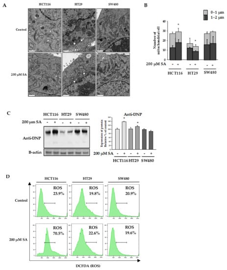 Mitochondrial morphology. HCT116, HT29, and SW480 cells were treated with 200 µM SA for 48 h. (A) The cells were fixed and viewed under a transmission electron microscope. Main observation is indicated by white arrows (scale bars: 1 μm). (B) Comparison of the number and size of mitochondria in each cell. (C,D) Intracellular ROS levels were measured using an anti-Dinitrophenol (anti-DNP) by Western blot and the 2′,7′-dichlorodihydrofluorescein diacetate (H2DCFDA). Data are representative values of three independent experiments and expressed as mean ± SD (n = 3), * p < 0.05.