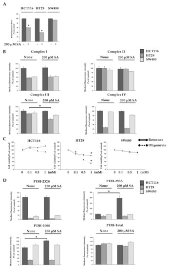Measurement of electron transport chain (ETC) and pyruvate dehydrogenase (PDH) activity. HCT116, HT29, and SW480 cells were treated with 200 µM SA for 48 h. (A) ATP levels in cells treated with SA treatment compared to untreated control. (B) Activity of complexes in HCT116, HT29, and SW480 cells treated with SA was measured. (C) Each cell was treated with rotenone or oligomycin on various concentration-dependent for 48 h, and cell viability was analyzed. (D) pyruvate dehydrogenase kinase (PDK) levels in the cells were measured to confirm PDH activity. Data are representative values of three independent experiments and expressed as mean ± SD (n = 3), * p < 0.05.
