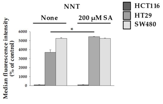Measurement of nicotinamide nucleotide transhydrogenase (NNT) activity. HCT116, HT29, and SW480 were treated with 200 µM SA for 48 h. Data are representative values of three independent experiments and expressed as mean ± SD (n = 3), * p < 0.05.