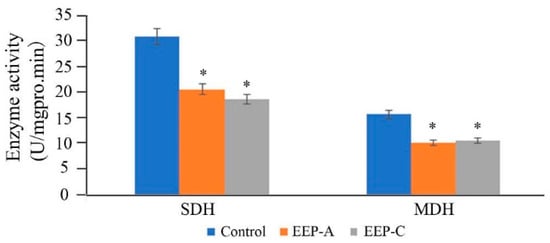 2.5. Effect of EEP on the Activities of Succinate Dehydrogenase (SDH) and Malate Dehydrogenase (MDH)