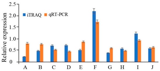To validate the reliability of the iTRAQ data, the expression levels of 10 genes were randomly selected for qRT-PCR assays (Figure 6). The results showed that the expression levels detected by qRT-PCR were consistent with the iTRAQ data, indicating that the qRT-PCR data estimate the reliability of the results from the iTRAQ analysis.