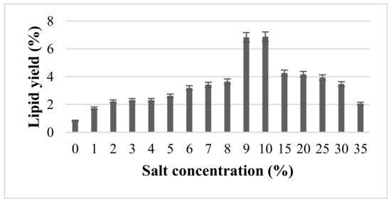The effect of different NaCl salt concentrations on the extracted lipid using microwave-assisted extraction (MAE) at 10% (w/v) solid loading, 100 °C and 5 min.