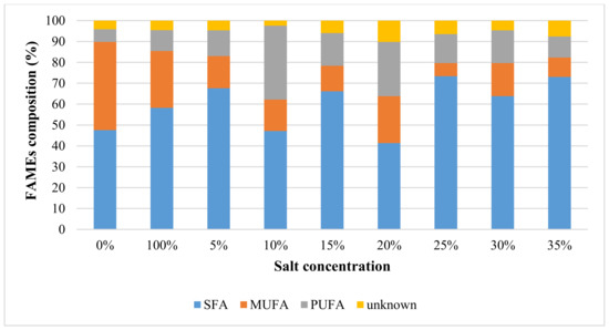 The distribution analysis of FAMEs classes for Nannochloropsis sp. microalgae using MAE technique at constant extraction parameters of 10% (w/v) solid loading, 100 °C and 5 min with different salt concentrations ranging between 0 and 35%.