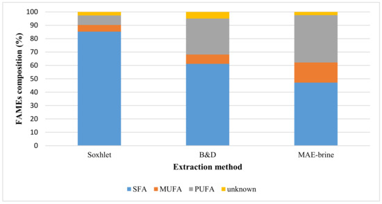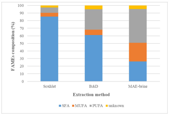The results from conventional extraction are in agreement with that reported previously [57]. Polar solvents (chloroform and methanol) used in B&D extraction displayed more ability in extracting polar lipids from microalgae cell membrane, such as PUFAs. The Soxhlet extraction with non-polar solvent (hexane) exhibited more tendency towards neutral lipid extraction, thus resulting in the Soxhlet method extracting more SFAs than PUFAs.