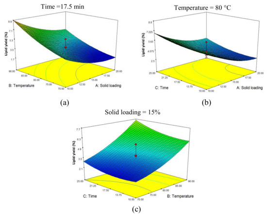 Response surface plots displaying the effect of (a) microwave solid loading and extraction temperature, at Time = 17 min (b) microwave solid loading and extraction time, at Temperature = 80 °C and (c) the extraction temperature and time at Solid loading = 15% on lipid extraction yield.