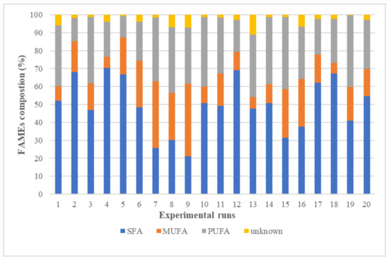 The compositions of lipid obtained from the 20 runs in RSM experiment were determined by using GC-FID. The results for the 20 FAs were analyzed and classified into classes (see Figure 7). It is apparent that the compositions of FAME varied according to the experimental conditions. Most of the experimental runs had a majority of either PUFAs class or SFAs class, while a minority for MUFAs class. The best PUFAs percentages of 40.2%, 39.9% and 38.5% were given by runs 15, 19 and 10, respectively, with the common denominator among these experiments was the high extraction temperature of 100 °C and 90 °C and the long extraction time of 25 min for runs 10 and 19. The results indicated that the PUFAs fraction could be affected by microwave extraction temperature and time.