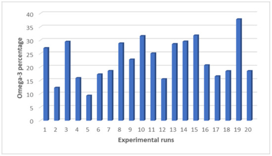 The most abundant FA among PUFAs is EPA, omega-3 FA. Figure 8 illustrates the changes in the distribution of omega-3 FAs, depending on the tested parameters. In general, it seems that the trend of omega-3 percentages is mostly influenced by temperature and time. When the extraction temperature and time increased, the EPA content increased, hence the increment in omega-3 percentage. As discussed above, the EPA is one of the most abundant compounds in Nannochloropsis sp. with the most influence on the PUFAs proportion.