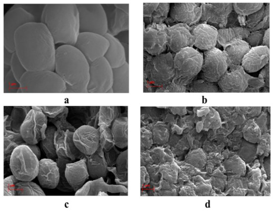 In order to determine the structural impact of the extraction methods at the cellular scale, the morphologies of the microalgae cell were observed by SEM. Figure 10a–d shows the SEM pictures of Nannochloropsis sp. microalgae before and after conventional and MAE-brine extraction methods. It is clear that the whole cells following Soxhlet and B&D extraction in Figure 10b,c, respectively, are intact, similar to that of the untreated microalgae cells. The surface and size, however, have changed from smooth to the wrinkled surface and appear shrunken, especially after B&D extraction. Meanwhile, in Figure 10d, it is clear that the cell has disrupted, showing only debris of the cell walls. Thus, it is hypothesized that conventional and MAE methods follow different mechanism of lipid extraction. For Soxhlet and B&D methods, it could be deduced that the diffusion is the extraction mechanism. Meanwhile, the disruption is the main mechanism for the lipid extraction using MAE-brine technique.