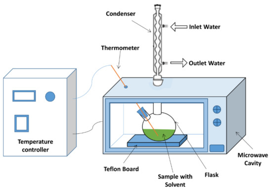 The MAEs were performed in a modified domestic microwave (Samsung, ME711K) combined with a temperature control device that had a working temperature ranging between 20 and 240 °C. The microwave had a maximum output of 800 Watt that operated at a frequency of 2.45 GHz. The top of the microwave cavity had two 25 mm round holes, with the center hole connecting the round bottom flask with the condenser cooled by tap water, while the side hole facilitating the installment of thermocouple in the solvent. A Teflon board was placed at the bottom of the flask to ensure no arching during microwave runs. Both timer and temperature were controlled via the control system attached to the microwave oven. Figure 11 illustrates the schematic drawing of the microwave system.