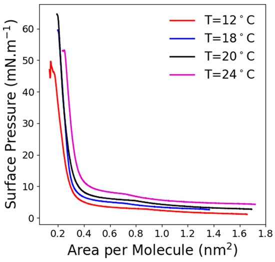 Surface pressure-area per molecule (π-A) isotherms of C11F23CO2H at various temperatures.