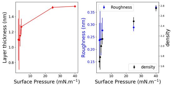 On the contrary, one observed in the fluid phase that the thickness of the monolayer increased from 1.1 to 1.3 nm, corresponding to an average tilt angle for the chains of 42° to 30°, respectively (using the 1.5 nm thickness as the reference for the vertical molecule). The film density increased from 1.5 up to 2.4 when the surface pressure varied from 2 to 4 mN/m (corresponding to the molecular area of 1.7 and 1.1 nm2/molecule, respectively). The surface roughness increased from 0.24 nm for the fluid phase to 0.35 nm for the LC one. This could be justified by the fact that the surface tension is lower in the LC phase, leading to weaker damping of the capillary wave height fluctuations. These values which range within 0.3 nm are observed on pure water [20,21].