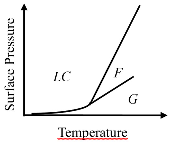 Of course, at very low surface density, the existence of a 2D Gas-phase can be expected. The question raised is how the transition between the two phases (fluid and LC) evolves at a higher temperature since, above a critical temperature, one expects a second-order transition. However, a second-order transition between two distinct phases is not possible with symmetry breaking [29], which is not the case for the G-LC transition. This new intermediate 2D smectic C phase then allows the possibility of the two successive second-order phase transition [30]. Thus, three phases should be considered in the phase diagram of monolayers formed by perfluorinated molecules (Figure 9): The G (gas) phase not measured at the densities explored in this work, the F phase (similar to a 2D smectic C), and the LC (Liquid condensed). The expected two successive phases transitions, G ==> F ==> LC, would be difficult to check experimentally.