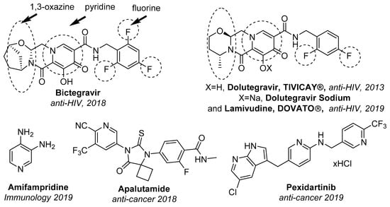 Selected FDA approved drugs in 2018 and 2019 containing pyridine moiety, fluorine atoms, 1,3-oxazine moiety.