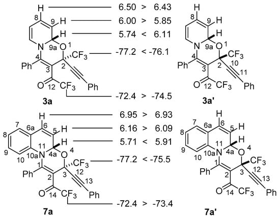 Analysis of the reaction mixture by NMR showed clean formation of 3a and unreacted starting materials. After addition of a small amount of MeCN to form homogeneous solution the reaction mixture was left overnight. As a result, oxazine 3a was isolated in 94% yield in stereoselective manner. According to NMR a 90:10 mixture of 2S*,9aS* and 2R*,9aS* diastereomers was formed. Assignment of both diastereomers was maintained by careful comparison with 3-arylethynyl-3-trifluoromethyl-1,3-oxazinoquinolines 7 having similar structures (Figure 2) []. Therefore, values of δ(1H-8), δ(1H-9), δ(19F-COCF3) in 2S*,9aS*-3a are larger than in 2R*,9aS*-3a′ while values of δ(1H-9a) and δ(19F-CF3) are the other way around. The same regularity can be seen in the NMR of 3S*,4aS*- and 3R*,4aS*-diastereomers of 7a.