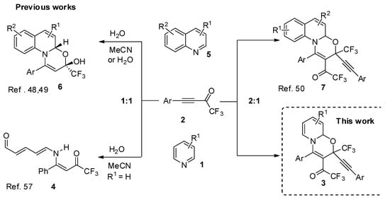 In contrast to the reaction with quinolines, our attempt to involve pyridines into 1,3-oxazine assembling reaction with CF3-ynones has been less successful. The reaction of pyridine with equal amount of CF3-ynone in wet acetonitrile afforded the corresponding ring opening product. Polyunsaturated 5-amino-2,4-pentadienal 7 has been isolated as a result of cascade transformation (Scheme 1) [].