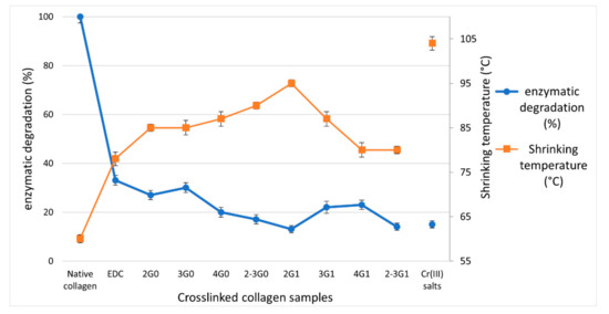 The two lines in Figure 2 show an opposite trend which is in good accordance with the fact that when collagen is not cross-linked, or is poorly cross-linked, enzymatic degradation should be high and Ts low; the opposite is true for highly cross-linked samples. In particular, collagen samples which are cross-linked with EDC/NHS (Ts 80 °C) have a loss in weight of 33% after collagenase degradation, while in the best cross-linking conditions employing EDC/NHS and 2-Triet-G0.0 (Ts 90 °C) or 2G1.0 (Ts 95 °C) (See Table 2), the degradation wt% decreases to 17 and 15% respectively, i.e., almost equivalent to the value achieved in the presence of Chrome(III) salts.