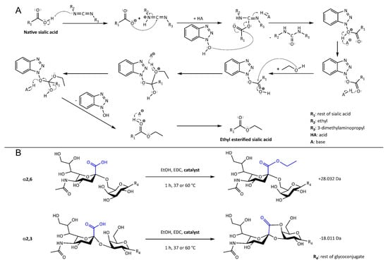 The latter approach allows the differential modification of sialic acids with distinct glycosidic linkages, enabling their discrimination by MS. To obtain linkage-specific derivatives, a nucleophile (i.e., an alcohol or an amine) is customarily applied in the presence of a condensing reagent. A successful reaction involves the nucleophile to react with α2,6-linked sialic acids, while α2,3-linked sialic acids form a lactone [13,14].