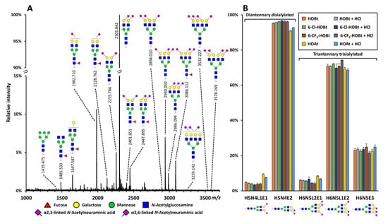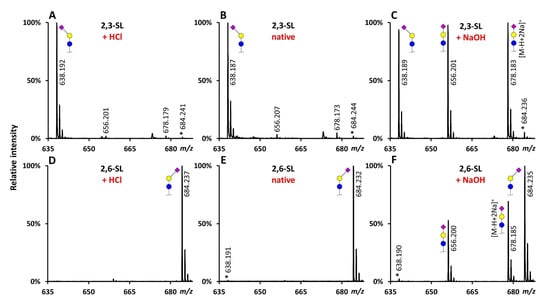- Wheeler, S.F.; Domann, P.; Harvey, D.J. Derivatization of sialic acids for stabilization in matrix-assisted laser desorption/ionization mass spectrometry and concomitant differentiation of alpha(2 --> 3)- and alpha(2 --> 6)-isomers. Rapid Commun. Mass Spectrom. 2009, 23, 303–312. [Google Scholar] [CrossRef] [PubMed]