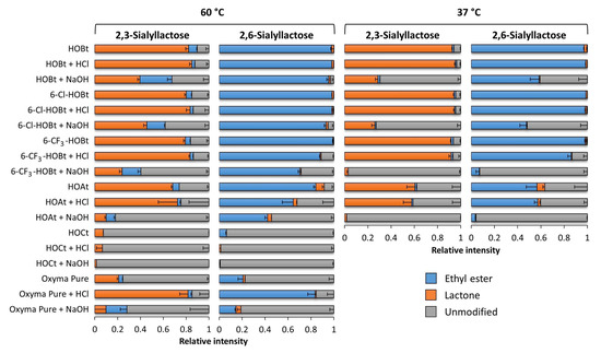 The use of the HOBt analogues 6-Cl-HOBt and 6-CF3-HOBt resulted in comparable yields for all reaction products as HOBt, when used at native conditions at 37 °C or 60 °C. While, 6-Cl-HOBt performed also similar to HOBt at low and high pH, 6-CF3-HOBt showed a substantial lower efficiency to catalyze the linkage-specific reactions at pH 3 for 2,6-SL (86.3% ± 3.0% ethyl ester formation at 37 °C) and at pH 9 for both linkage variants (>90% under modification at 37 °C) (Figure 4).