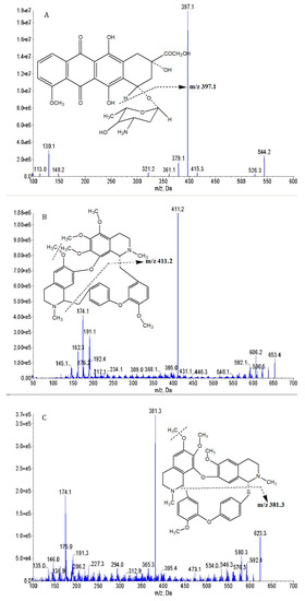 Representative MS of (A) doxorubicin (DOX), (B) hernandezine (HER), and (C) tetrandrine (IS).