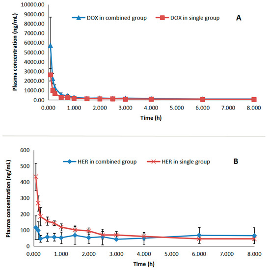 The Cmax of DOX in the single group and combined group was 2647 ± 650 ng/mL and 5703 ± 2980 ng/mL, respectively. Meanwhile, the AUC0–∞ was 1412 ± 114 ng/mL and 2453 ± 218 ng/mL, respectively. Meanwhile, the t1/2 was 4.6 ± 0.8 h and 4.2 ± 0.6 h, and the MRT0–∞ was 4.9 ± 0.9 h and 4.5 ± 0.5 h, respectively. Significant differences of Cmax and AUC0–∞ of DOX were observed between the single and combined groups with equivalent doses of DOX administration, which indicated that HER could increase the absorption of DOX. However, there was no significant difference between the t1/2 and MRT0–∞ of DOX, which indicated that HER had no effect on DOX’s elimination and excretion. In turn, we could see from the plasma concentration–time curves of HER in two treatment groups in Figure 3 that the combination use of DOX made the pharmacokinetic behavior of HER no longer fitted to a non-compartmental model that was used to calculate the pharmacokinetic characteristics in this study. However, we were still able to reach a conclusion from the plasma concentration–time curve and the pharmacokinetic characteristic of HER that the free drug concentration of HER was reduced by the combination use of DOX. The possible reason might be the enhancement of DOX on the drug–protein binding of HER.