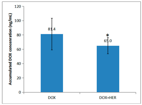 The comparison of the accumulated concentrations of DOX in myocardial tissue 8 h after intravenous administration of single DOX and combination of DOX and HER was investigated as shown in Figure 4. A significant difference between the two groups could be observed (p < 0.05), indicating that HER was able to reduce the accumulation of DOX in myocardial tissue. Meanwhile, recent studies demonstrated that doxorubicinol (DOX-ol), a secondary alcohol metabolite of DOX [24,25], which may have caused cardiac toxicity by being poorly cleared from the heart and accumulating there to form a long-lived toxicant to heart [26], was to blame. Therefore, the next step is to study whether HER could inhibit the conversion of DOX into DOX-ol, which might be considered as a therapeutic target for DOX-induced cardiac toxicity.