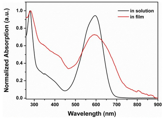 The absorption spectra of 4BAI-SFX in dilute chloroform solution and spin-coated film are shown in Figure 1. Both of the spectra exhibit two groups of featureless absorption bands. In the short-wavelength region (below 400 nm), the absorption bands can be ascribed to the n→π* and π→π* transitions of the SFX core; long-wavelength absorptions (above 450 nm) can be attributed to the intramolecular charge-transfer (ICT) transitions of acceptor–donor–acceptor (A-D-A) structures [21], which are BAI–fluorene–BAI and BAI–xanthene–BAI arrangements. The maximum absorption peaks are located at 596 nm for the solution with a large molar absorption coefficient of 1.5 × 105 M−1 cm−1 and at 593 nm for the film, respectively. The almost identical peak positions of maximum absorptions imply weakened intermolecular interactions of 4BAI-SFX benefiting from the 3D molecular geometry [3,20]. According to the absorption edge of 4BAI-SFX in CHCl3 solution, the band gap was calculated to be 1.80 eV.