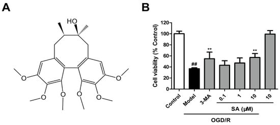 An OGD/R model was utilized with differentiated PC12 cells to further investigate the neuroprotective effects of SA (chemical structure shown as Figure 1A) in vitro. The MTT assay (Figure 1B) showed that OGD/R induced a significant decrease in cell viability compared to control cells, whereas the SA (10 μM) and 3-MA treatment significantly increased cell survival, respectively. SA (10 μM) significantly reversed cell death caused by OGD/R injury.