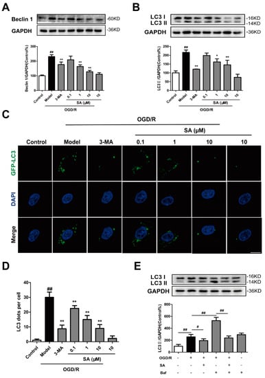 Next, we tested whether SA regulates autophagy in our in vitro ischemic model. Beclin1 and LC3 are biomarkers for autophagy activation in mammalian cells. To examine autophagic activity after OGD/R and to determine whether SA could inhibit the activation of autophagy, we tested the protein expression of LC3 and Beclin1 in the ischemic PC12 cells. We found that the level of Beclin1 and LC3-II following OGD/R was significantly greater than that following the control treatment and that SA (1 and 10 μM) could significantly inhibit the increased expression of Beclin1 (Figure 2A) and LC3-II (Figure 2B) following OGD/R. The number of LC3-positive puncta per cell was determined by LC3 plasmid transfection. As shown in Figure 2C,D, either SA (0.1–10 μM) or 3-MA pretreatment effectively inhibited the OGD/R-induced increase of LC3 dots in PC12 cells. However, compared with the control group, 3-MA and SA did not significantly reduce the level of autophagy (Figure 2B and Figure S1A). In addition, we also examined the effect of SA on autophagic flux. We found that SA treatment resulted in decreased LC3-II levels in PC12 cells following Bafilomycin A1 (Baf) treatment, compared with the model group treated with Baf (Figure 2E). It suggested that SA could inhibit the autophagosome formation at the early stage of autophagy. Interestingly, the level of LC3-II following Baf treatment was significantly greater than that of the control group, while SA treatment did not inhibit the Baf-induced increase of LC3-II levels in PC12 cells (Figure S1B).