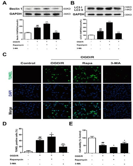 PC12 cells were treated with the autophagy inducer rapamycin and inhibitor 3-MA to determine the role of autophagy in our in vitro ischemia model. The results of the Western blotting showed that the increased Beclin 1 (Figure 3A) and conversion of LC3-I to LC3-II (Figure 3B) induced by OGD/R were further enhanced by rapamycin treatment. Rapamycin can also significantly enhance basal autophagy in PC12 cells (Figure S1A). Treatment with rapamycin significantly increased the number of TUNEL positive cells (Figure 3C,D) and decreased cell viability (Figure 3E) after OGD/R. However, 3-MA treatment significantly antagonized OGD/R-triggered autophagy induction and cell injury (Figure 3). Therefore, autophagy is a mechanism for OGD/R-induced cell death.