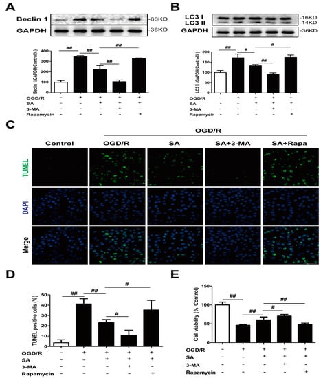 To determine whether autophagy was involved in SA-induced protection, PC12 cells were co-incubated with SA and autophagy inhibitor 3-MA or autophagy agonist rapamycin. Treatment with SA not only obviously reduced the levels of Beclin-1 (Figure 4A) and LC3 II (Figure 4B), but also improved TUNEL positive cells (Figure 4C,D) and cell viability (Figure 4E), which were blocked by treatment with rapamycin after OGD/R. On the contrary, 3-MA treatment further promoted the inhibition of SA on autophagy induction and cell damage induced by OGD/R (Figure 4).